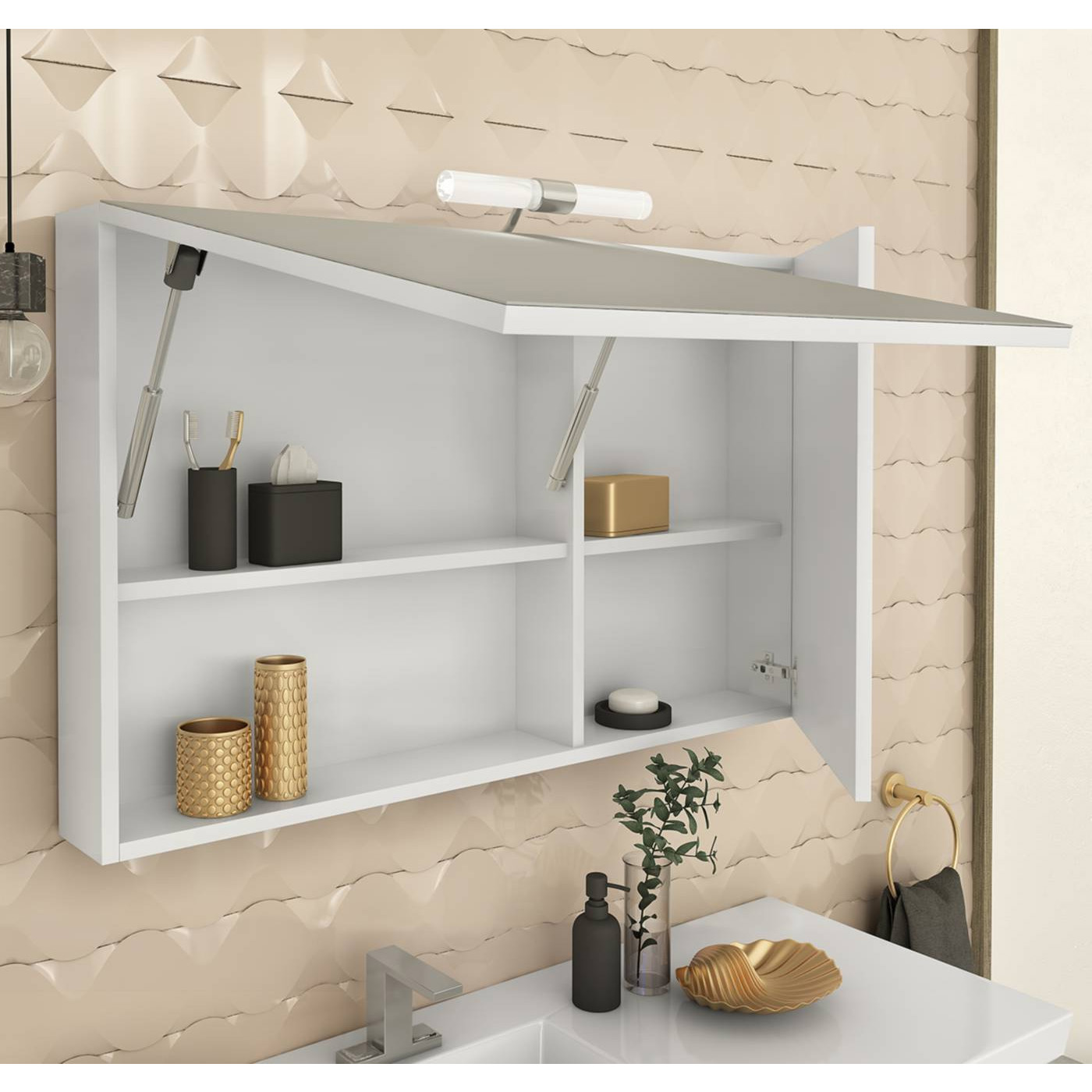 Καθρέπτης - 2 αποθ. χώροι - Αριστερή ανακλινόμενη πόρτα - Λευκή πολυεστερική λάκα γυαλιστερή.