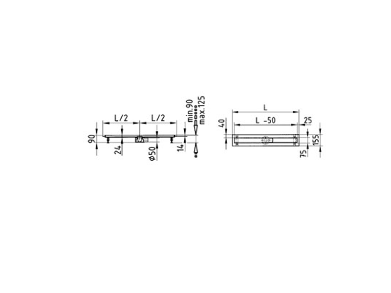 Ευθύγραμμο αυλάκι ανοξείδωτο V2A με ρυθμιζόμενα ποδαράκια από 90-125mm. Φέρει πατούρα για υποδοχή μόνωση και δέχεται σχάρα απορροής. Συνεργάζεται με σιφώνι εξόδου Φ50. Διατίθεται σε έξι τυποποιημένα μήκη.