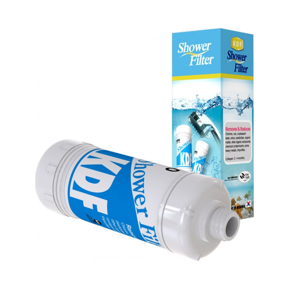 Φίλτρο ενεργού άνθρακα Kαρύδας και KDF. Συγκρατεί το χλώριο, οσμή και γεύση από το ΖΕΣΤΟ ΝΕΡΟ του μπάνιου.
